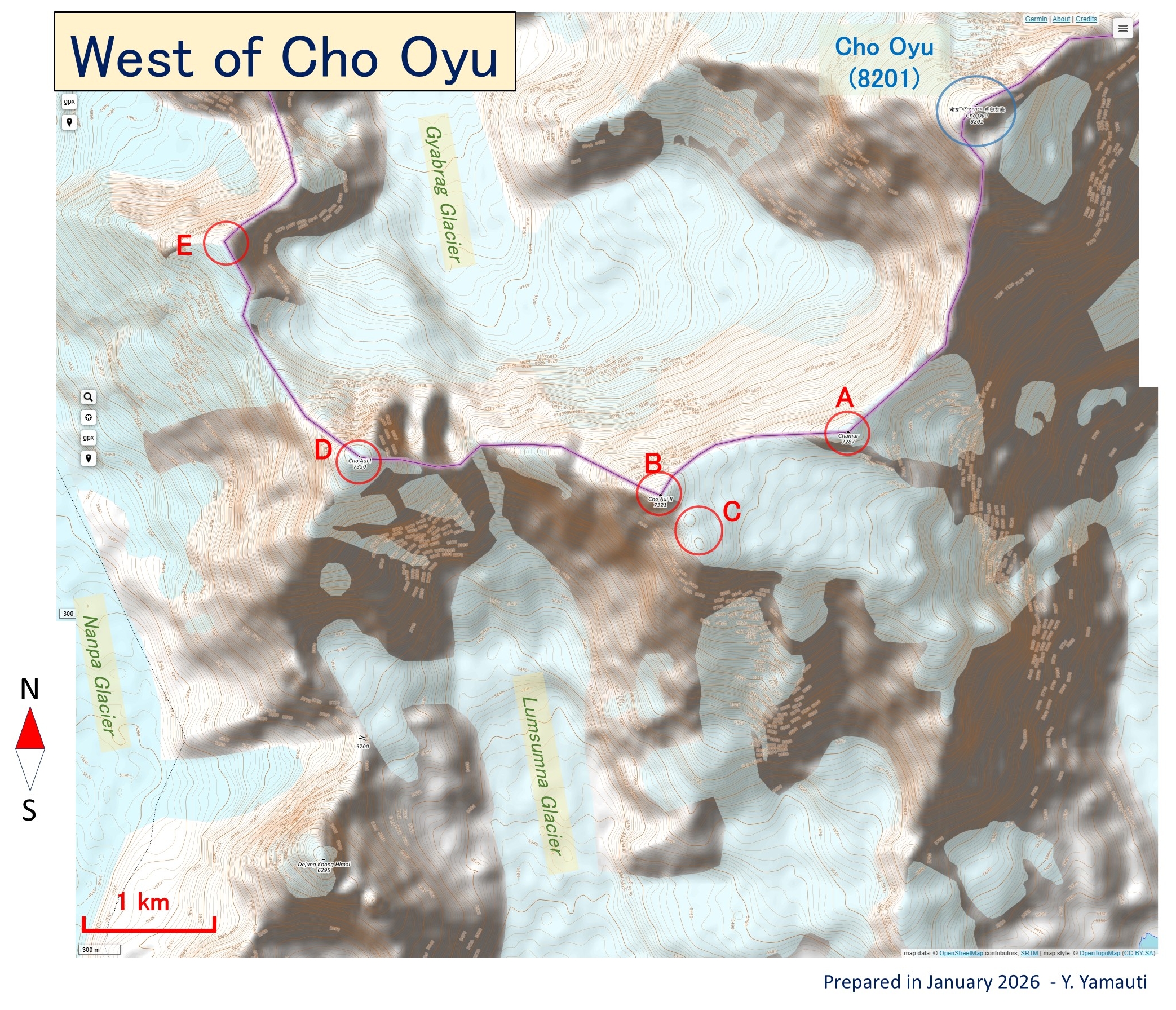 | Fig チョー・オユーの西に連なる7000m峰の概念図 (OpenTopoMap [ URL: https://opentopomap.org ] にデータ追加 ) | |||||||||||||||||||||||||||||||||||||||||||||||||||||||||||||||||||||||||||||||||||||||||||||||||||||||||||||||||||||||||||||||||||||||||||||||||||||